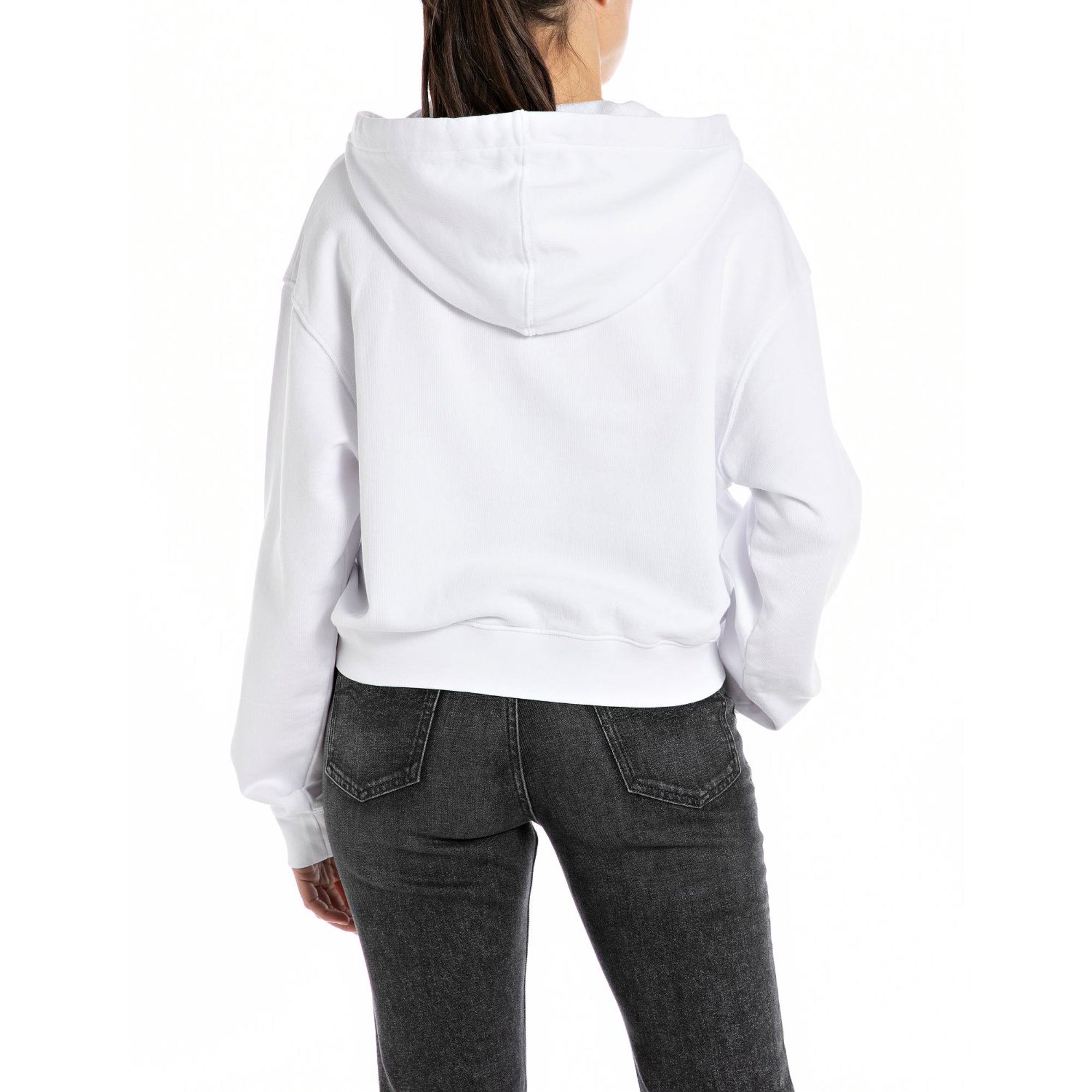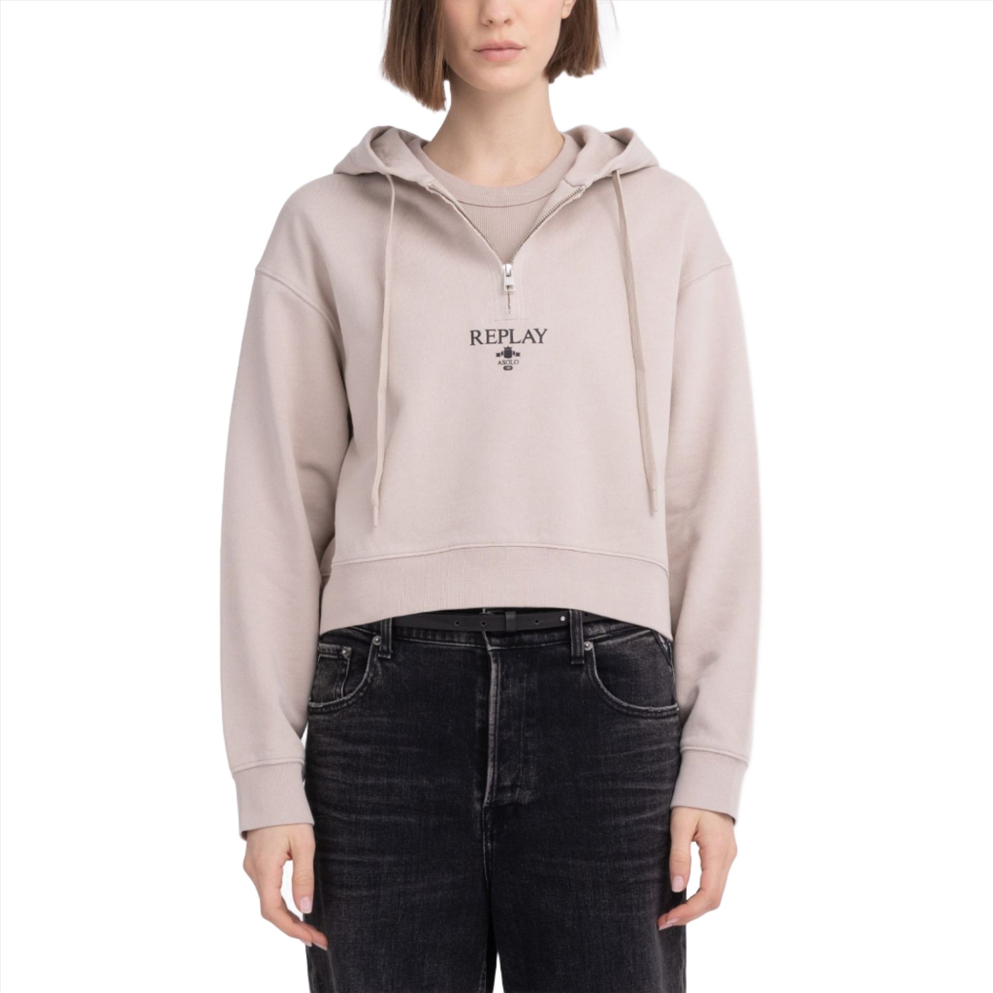 Cropped hoodie with drawstring made of piece-dyed soft and warm cotton. With dropped armholes, the garment is characterized by the mini print with logo at the front. The item is enhanced by the half-zipper fastening.
