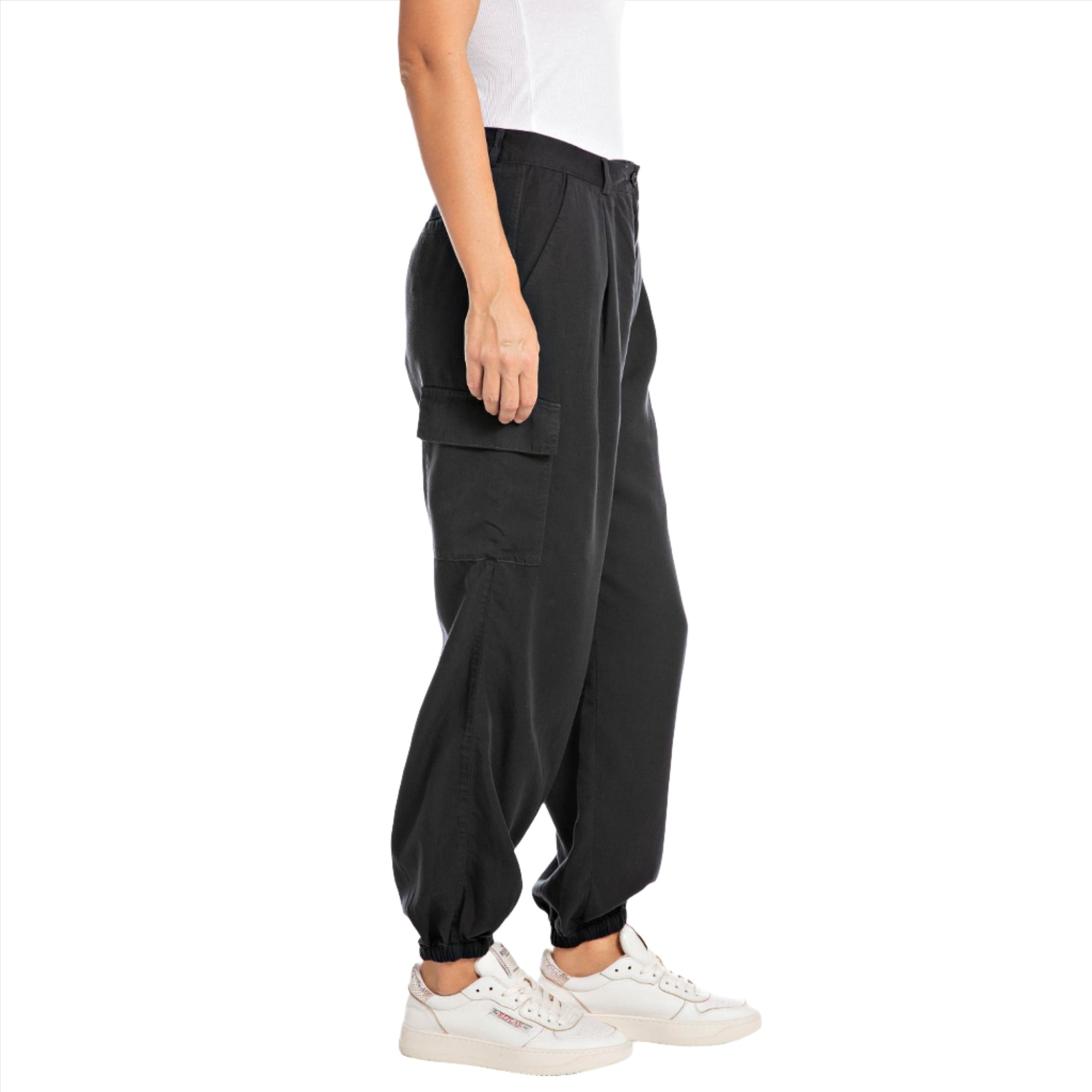 Cargo jogger trousers made of solid-colored Lyocell. With comfort and relaxed fit, the garment is equipped with two functional pockets at the front, on the sides and at the back. The item is enhanced by the covered fastening with inner hook and zipper.