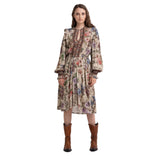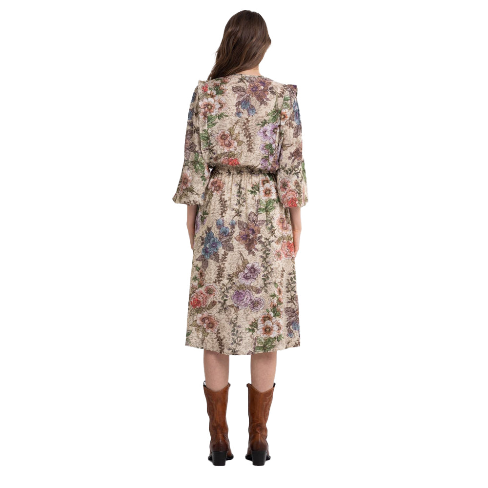 Crewneck dress made of viscose with all-over floral print and lurex details. The midi garment with long puffed sleeves and elasticated cuffs with ruffles, is refined by elegant contrasting-colored lace edges at the front.