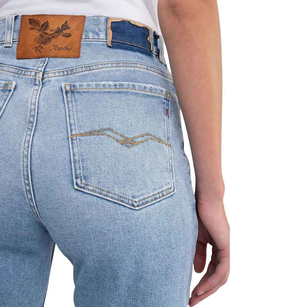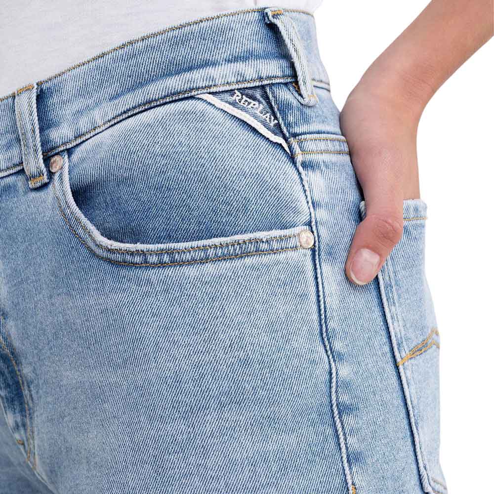 High waist tapered fit jeans with tapered leg. The vintage piece is made of 11 oz white weft deep blue comfort denim with a light wash tone. The five pocket item is characterized by the micro abrasions on the edges and by the chain with pearls hooked on the right side.