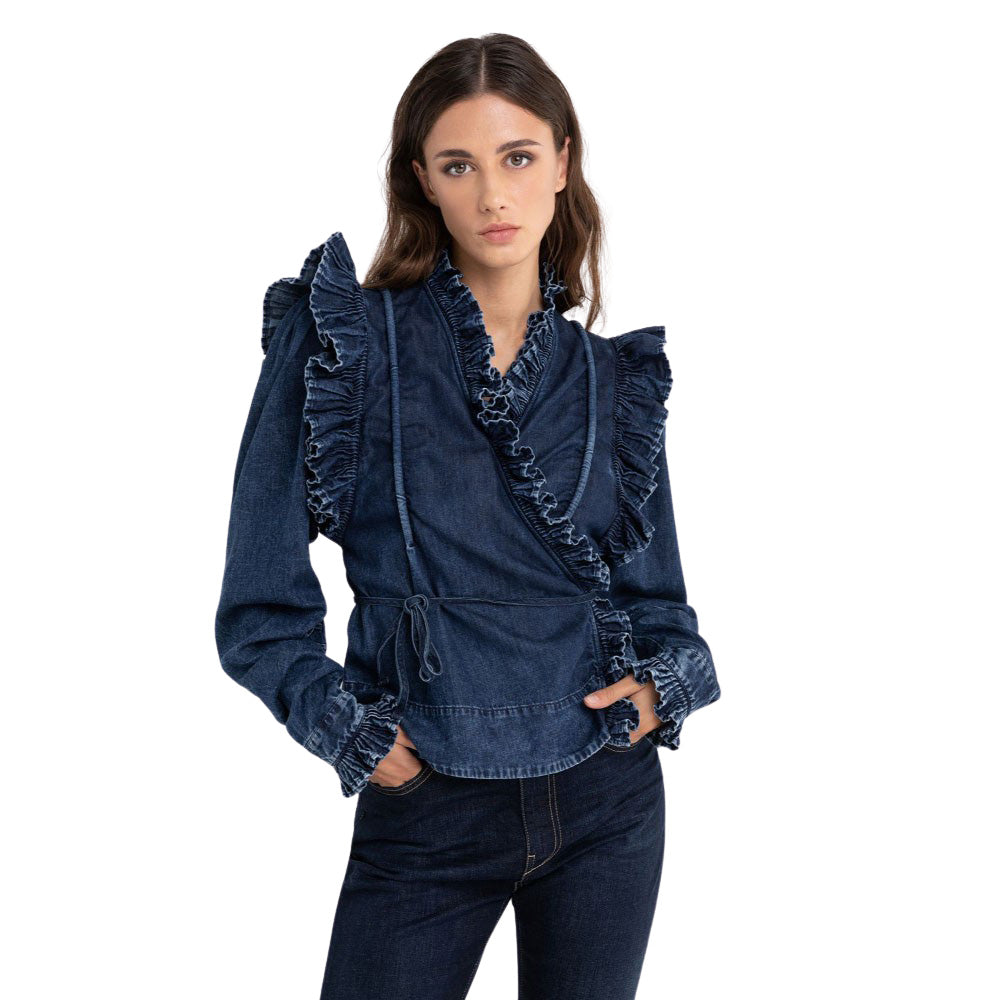 Shirt made of 5 oz indigo denim cotton twill with a dark wash tone. With V-neck and side gathering, the garment is characterized by the long puffed sleeves tighter at the hem with elasticated cuffs. The item is refined by the edges with wide ruffles and embossed stitching's at the cuffs. Atelier stands for a new way of wearing denim, with a refined and contemporary collection with clean-cut and feminine items that stand the test of time, season after season. The core Replay fabrics relieve in this collection with a mix of contrasts that ensure perfect wear ability and a unique style.