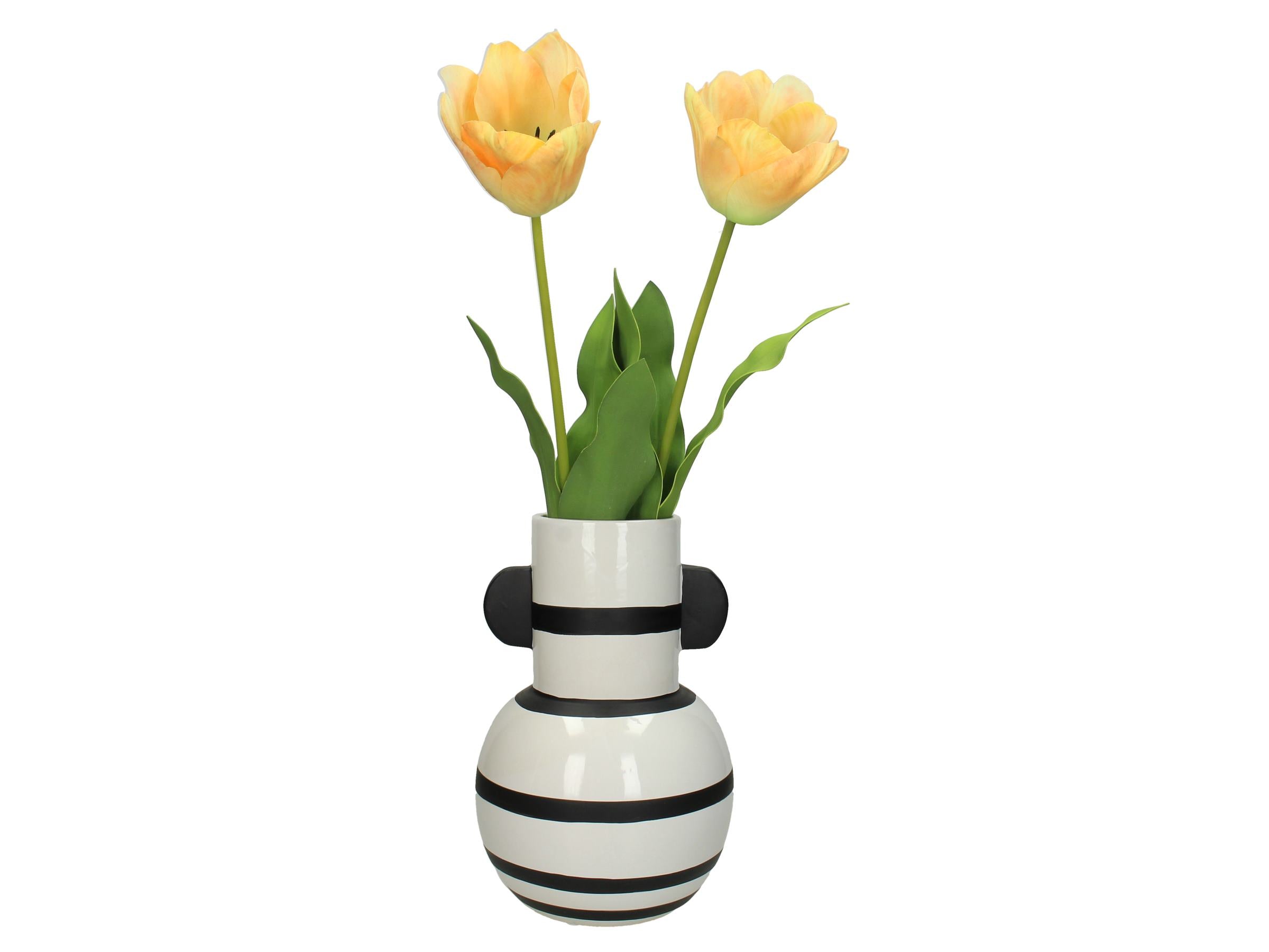 Kersten Vase Stripes Fine Earthenware White is a beautiful and unique vase that will make a stunning addition to any interior. The piece is made from fine earthenware which has been hand-painted with delicate stripes of black, giving it a timeless, yet modern feel. The size of this vase is 22x22x42 Cm which makes it the perfect size, easily fitting into any corner of your living space while still having the presence and impact of a larger design. The shape of this vase has been specifically designed to hold an array of floral displays; from single stems and long-stemmed bouquets to more intricate flower arrangements. The glossy white finish is neutral enough for any interior, and allows the natural beauty of the flowers to shine through. This vase would be the perfect centrepiece for dining and coffee table display. SPECIFICATIONS