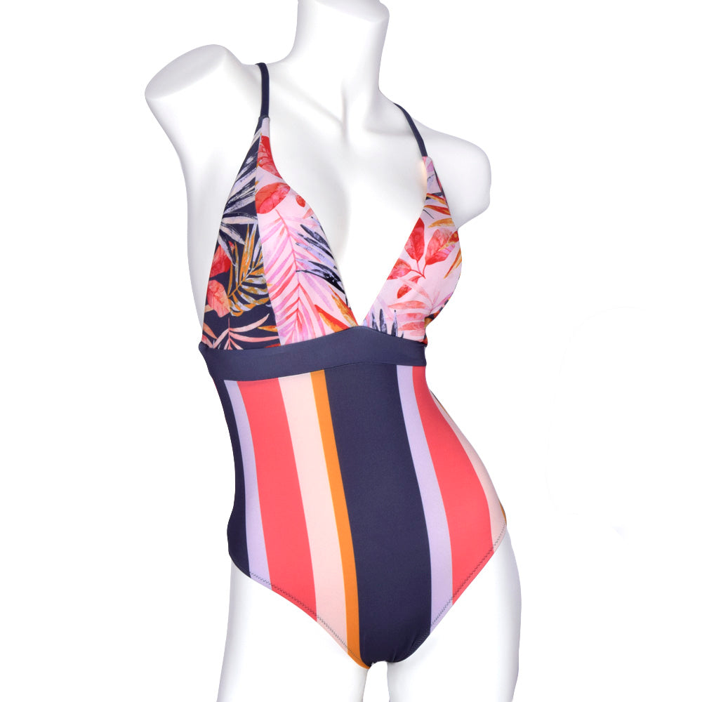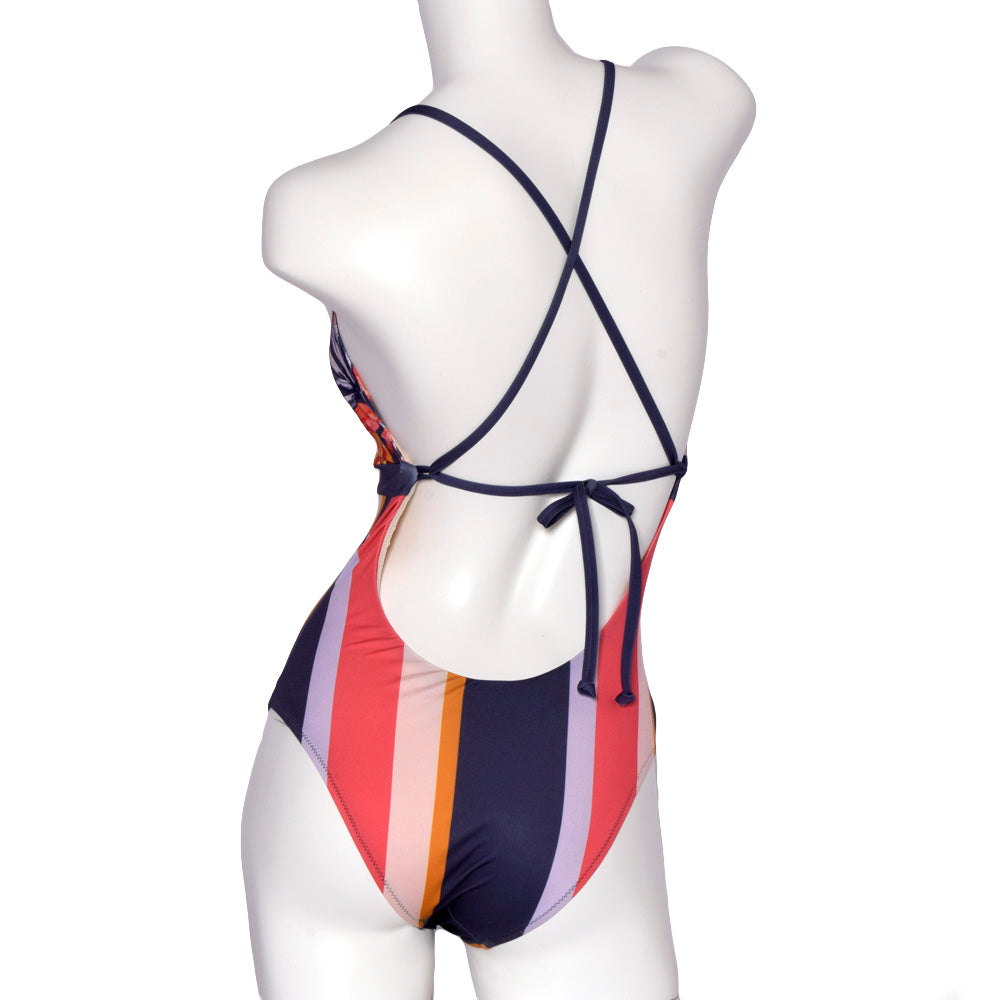 The printed padded one - piece swimsuit from Oasis line by Yamamay is in matt microfiber fabric. With an exotic print on the upper part with a wide neckline and large coloured vertica striped print in the rest of the costume. Rear crossover straps that tie on the back.