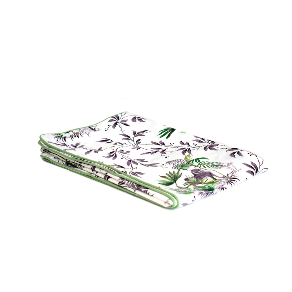 Shaded by foliage, sustained by a mysterious water source, palm trees and traveler's trees are drawn in shades of green at the heart of colored greys. The Mousson model reinterprets the exotic theme of 18th century toiles de Jouy, where wildlife relate the discovery of a new world. Through current day etching and coloring, this revisited classical printed fabric is one of the requisites of textile topicality.