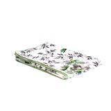 Luxury long-staple Combed Cotton, Printed Percale on white background, with piped finishing in green. 200 thread count.