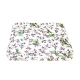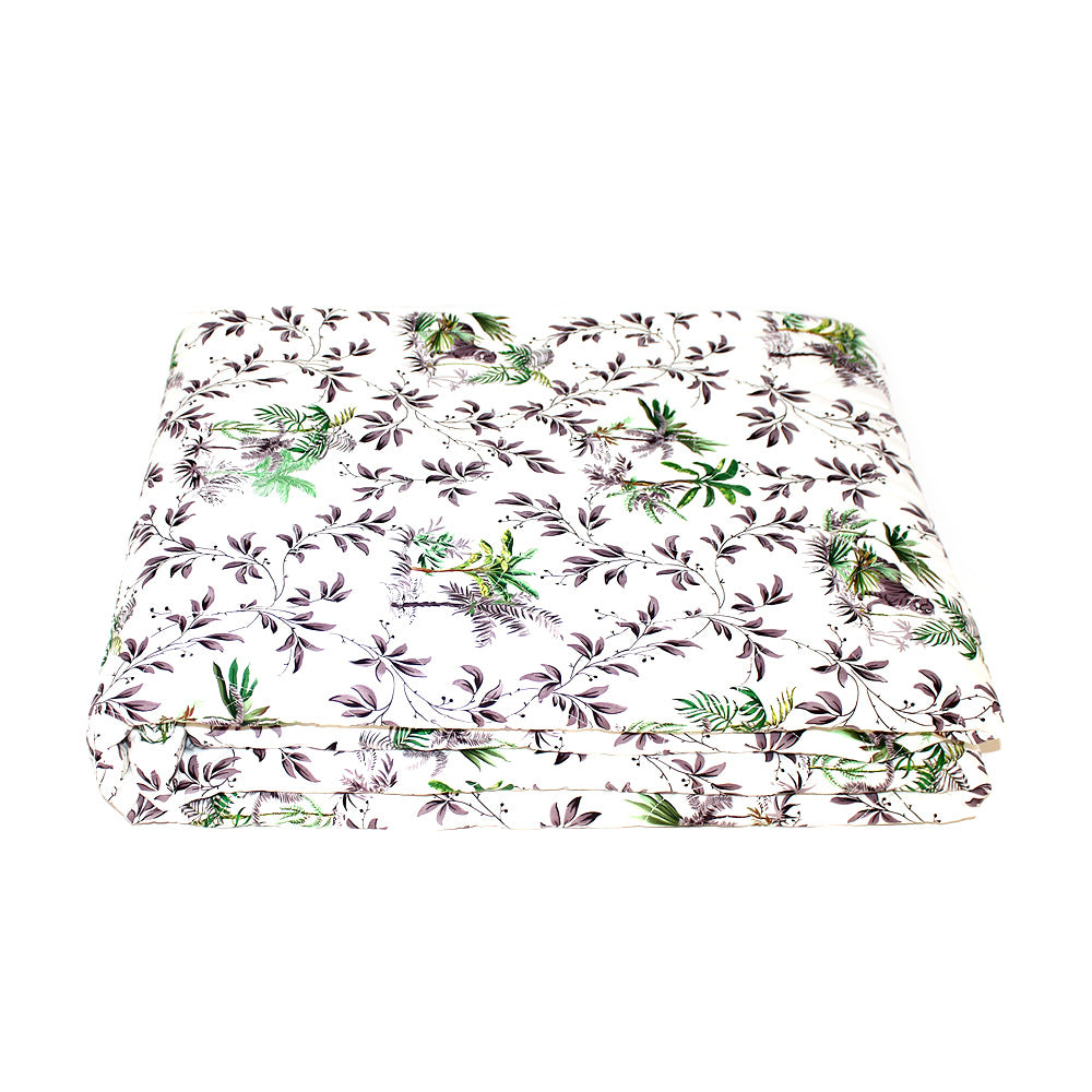 Quilted Coverlet reverses from vine and tropical floral print to white with palm tree print.