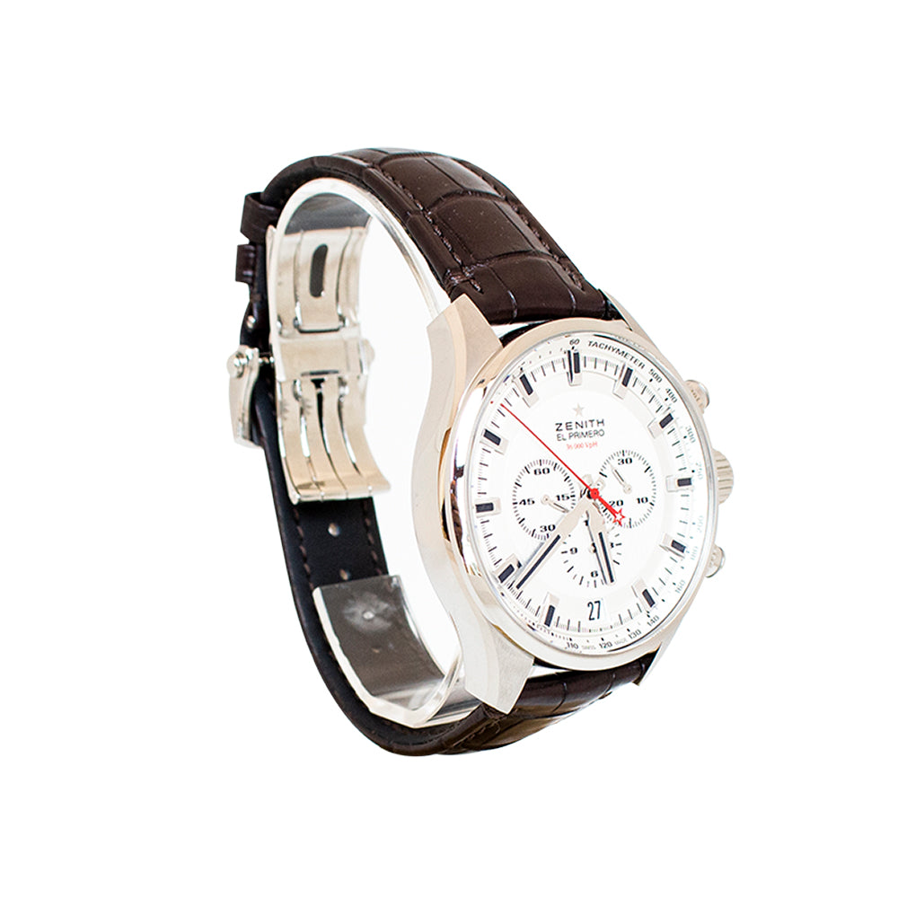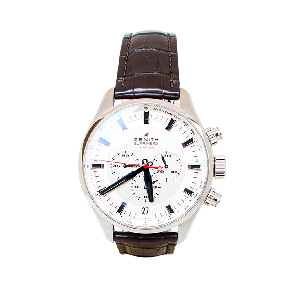 El primero sport 46mm el primero movement automatic chronograph steel silvered brushed dial brown alligator leather strap movement